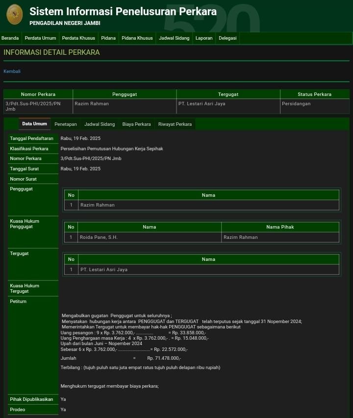 Jambi – Perselisihan pemutusan hubungan kerja oleh PT Lestari Asri Jaya (LAJ) terkait Pemutusan Hubungan Kerja (PHK) terhadap salah seorang pekerjanya yakni Razim Rahman kini berbuntut panjang.