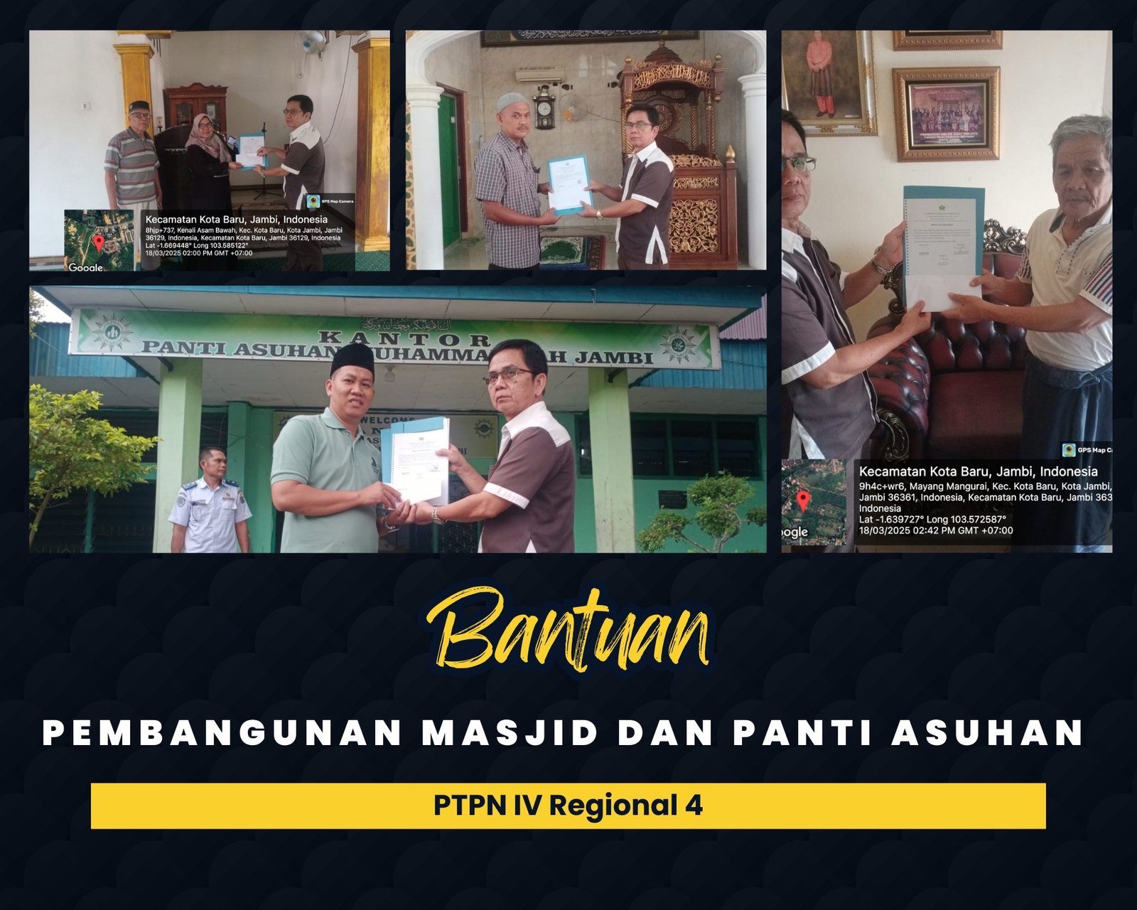Bantuan diserahkan kepada Panti Asuhan Muhamadiyah di jalan Adisucipto kelurahan Pasir Putih, kota Jambi pada Selasa (18/4/2025) diterima pengurus Panti Asuhan Muhamadiyah, Muhammad Yani. Bantuan uang tunai untuk memenuhi kebutuhan sembako sehari-hari untuk anak Yatim Piatu di panti yang di kelola ormas keagamaan Islam Muhammadiyah. Pada hari yang sama, Kasubag TJSL Regional 4, Jambi, Sumarfin Purba juga menyalurkan bantuan ke tiga masjid dalam kota Jambi.