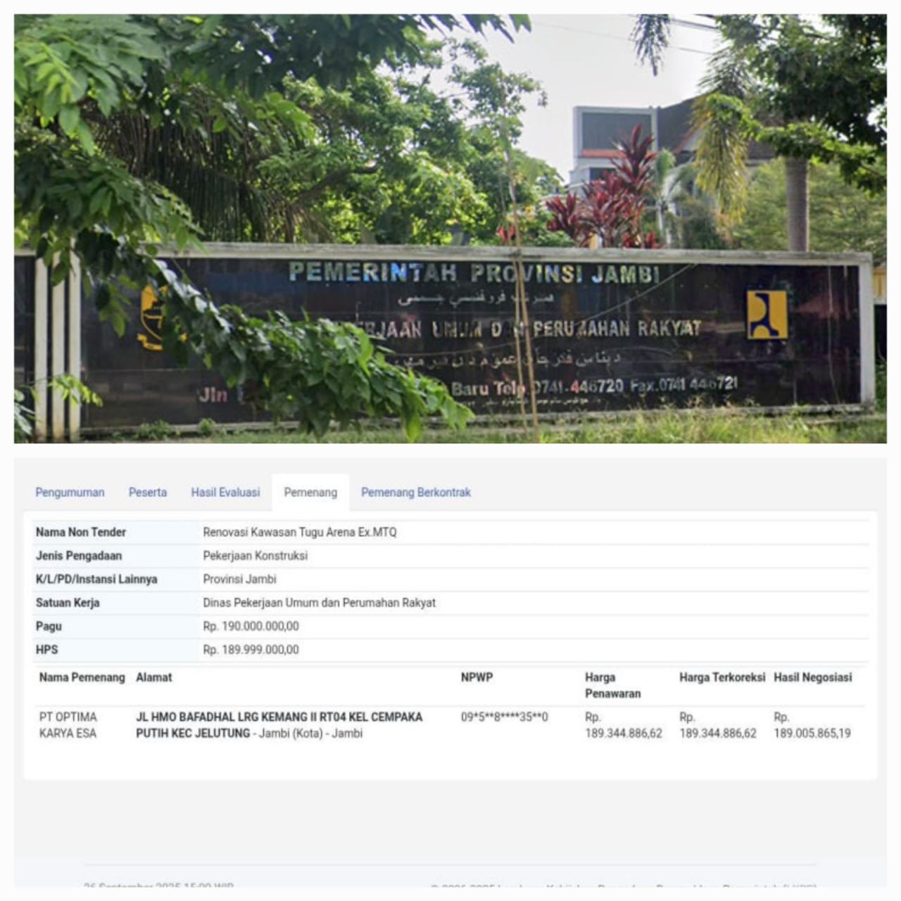 Salah satu yang disorot publik ialah paket Renovasi Kawasan Tugu Arena Eks MTQ dengan nilai kontrak Rp 189 juta. Proyek non tender ini tercatat dimenangkan oleh PT Optima Karya Esa, beralamat di Jalan HMO Bafadhal, Lorong Kemang II, RT 04, Kelurahan Cempaka Putih, Kecamatan Jelutung, Kota Jambi. Kontrak proyek diteken pada 25 Agustus 2025.